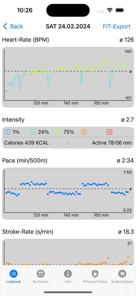 A detail page per workout shows the timelines of the heart-rate, the pace and the stroke-rate.